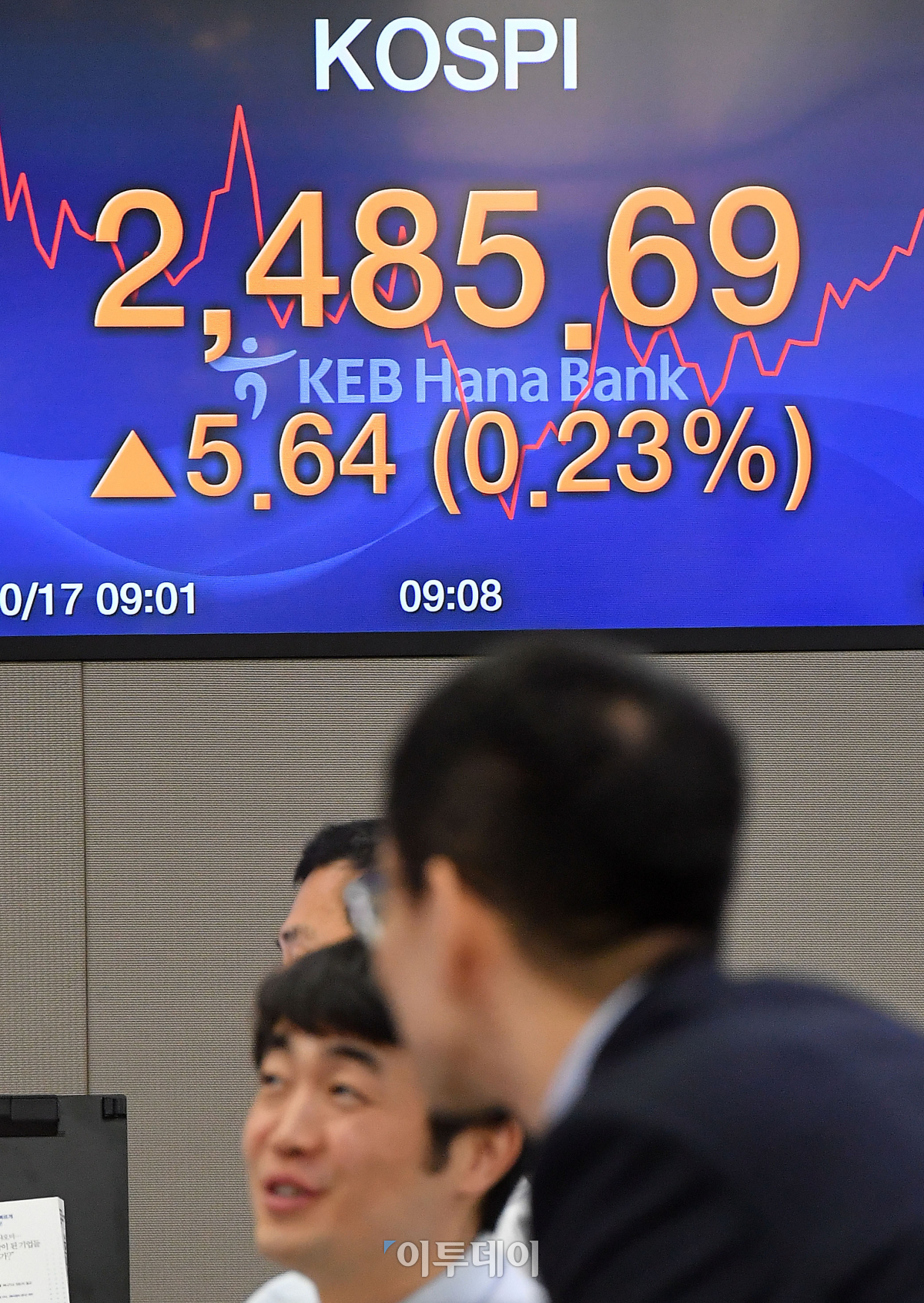 코스피 지수가 개인과 외국인의 '사자'기조에 상승세를 이어가며 출발했다. 17일 오전 서울 을지로 KEB하나은행 본점 딜링룸 전광판에 코스피 지수가 전 거래일 종가보다 5.64포인트 오른 2485.69를 나타내고 있다. 이동근 기자 foto@