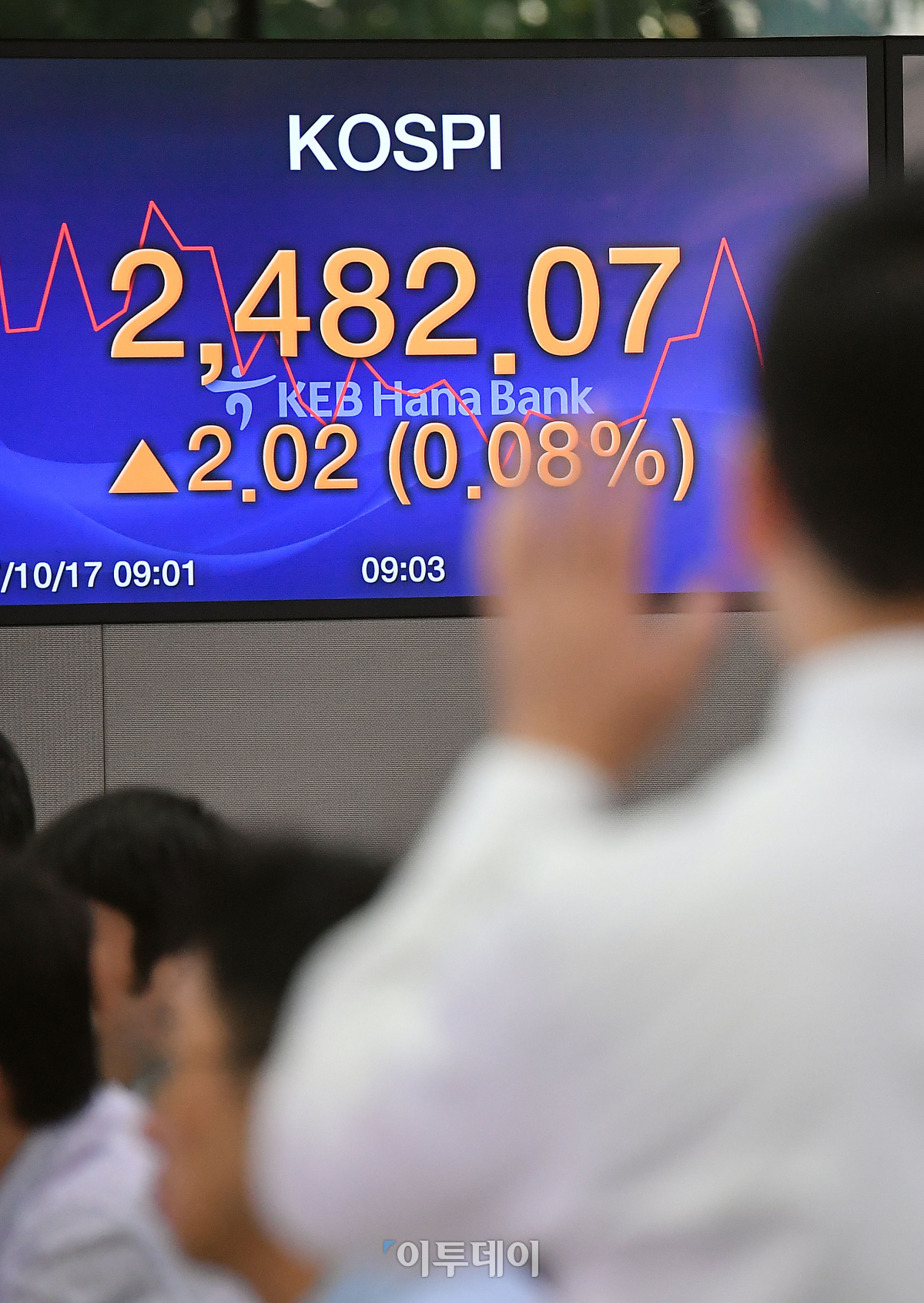 코스피 지수가 개인과 외국인의 '사자'기조에 상승세를 이어가며 출발했다. 17일 오전 서울 을지로 KEB하나은행 본점 딜링룸 전광판에 코스피 지수가 전 거래일 종가보다 2.02포인트 오른 2482.07을 나타내고 있다. 이동근 기자 foto@
