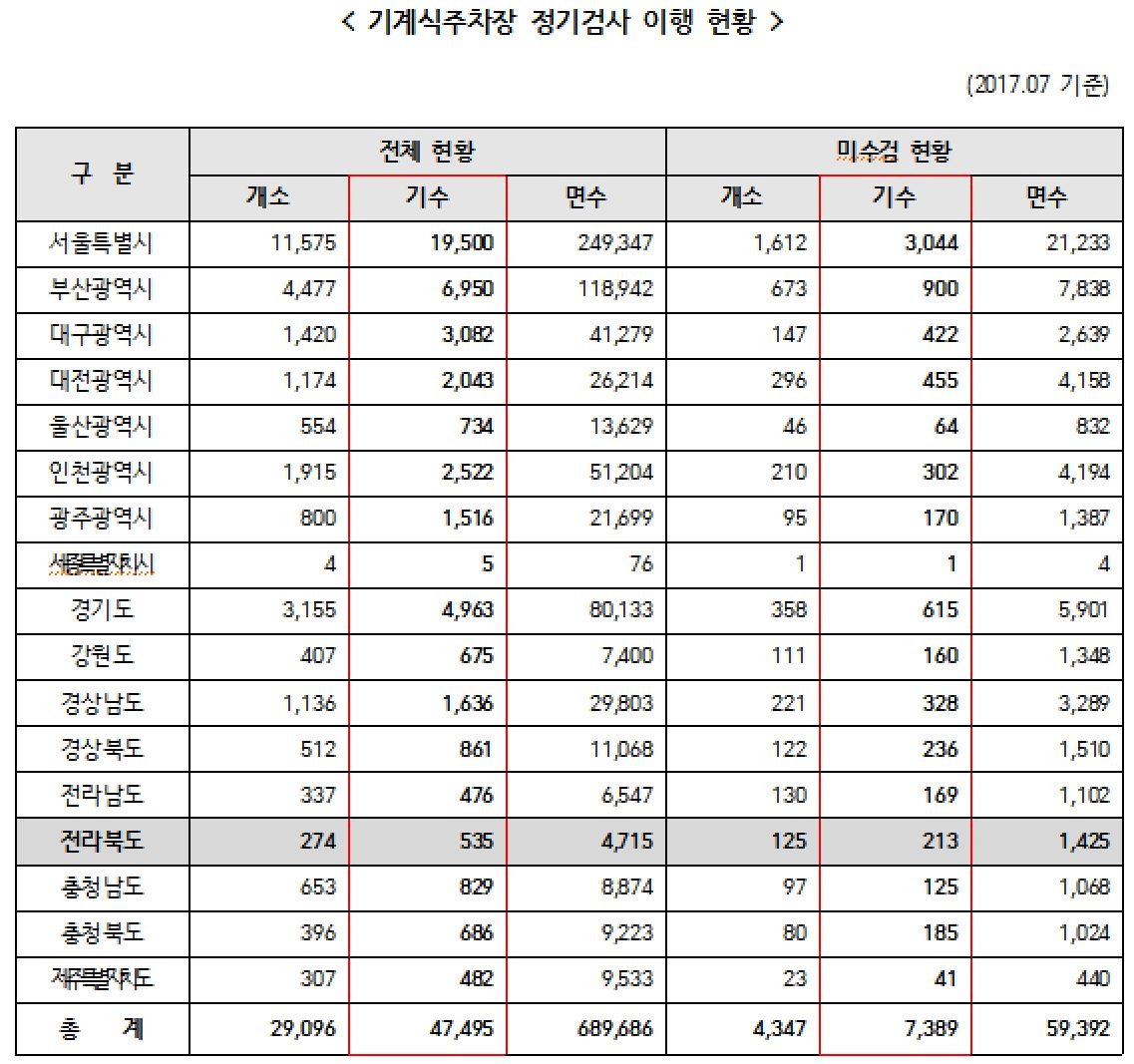17일 바른정당 이학재 의원(국회 국토교통위원회)이 교통안전공단에서 받은 자료에 따르면 지난 7월 기준 전국 4만7495개 기계식주차장의 15.5%인 7389개 기계식 주차장이 정기검사를 받지 않았다.