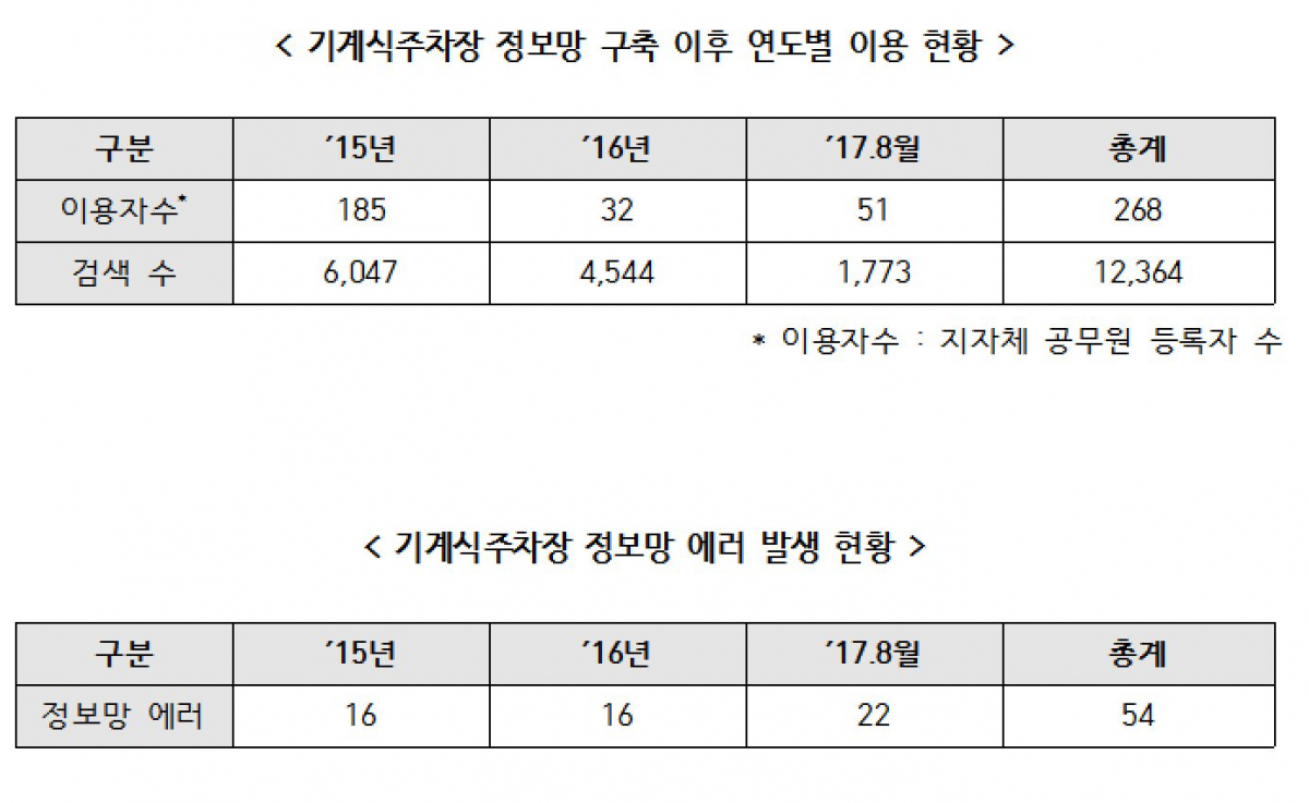 그러나 관리감독 권한이 있는 지자체 공무원의 기계식 주차장 정보망 이용은 낮은 실정이다. 2015년 구축 이후 올해까지 기계식 주차장 정보망을 이용하는 이용자 수와 검색 건수는 매년 감소하는 것으로 나타났다. 정보망 시스템에 오류가 발생한 건수도 54건에 이르는 것으로 드러났다.