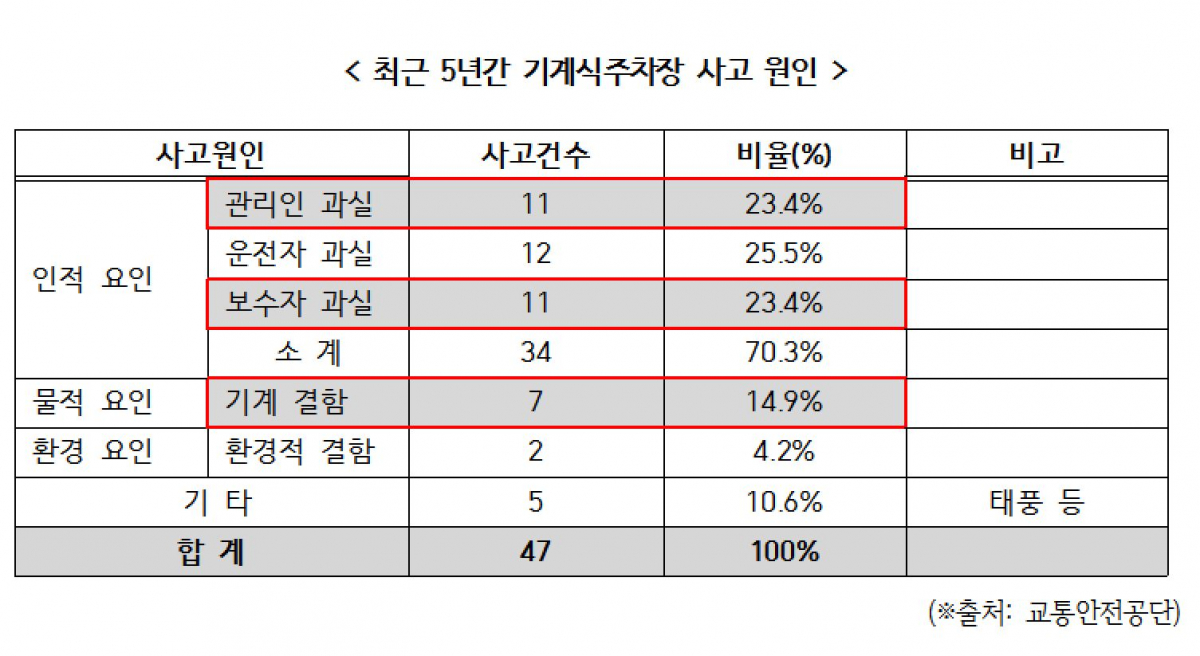 기계식 주차장에서 발생한 사고 원인은 △관리인 과실 △보수자 과실 △기계 결함 등 기계식주차장 관리 부실로 발생한 사고가 전체의 62%(29건)를 차지하는 것으로 나타났다. 현행 ‘주차장법’에는 기계식 주차장 관리 부실 등으로 인한 사고를 예방하기 위해 2년에 한 번씩 교통안전공단이나 한국승강기안전공단, 한국주차안전기술원 등 검사기관으로부터 정기검사를 받도록 규정하고 있다. 하지만 이를 지키지 않는 기계식 주차장이 적지 않은 게 현실이다.