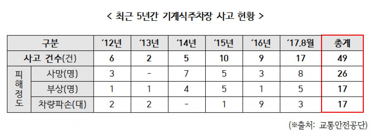 최근 6년간 기계식주차장에서 49건의 사고가 발생해 26명이 사망한 것으로 나타났다. 연도별로 보면 △2012년 6건 △2013년 2건 △2014년 5건 △2015년 10건 △2016년 9건 등이 발생했다. 올해의 경우 지난 8월 기준으로 17건이 발생해 전년 대비 약 2배나 증가한 것으로 나타났다. 연도별 사망자수는 △2012년 3명 △2014년 7명 △2015년 5명 △2016년 3명 △2017년 8명으로, 6년간 26명이 기계식 주자창 사고로 사망했다.