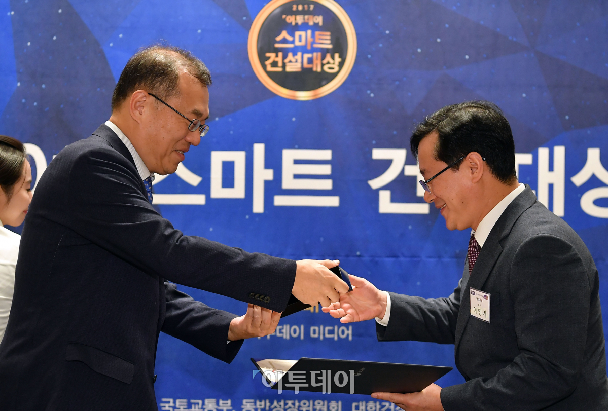 경제신문 이투데이가 주최하는 2017 스마트 건설대상 시상식이 17일 서울 종로구 포시즌스호텔에서 열린 가운데 김재정(왼쪽) 국토교통부 기획조정실장이 종합대상을 수상한 현대건설의 이인기 상무에 상장과 상패를 전달하고 있다. 이동근 기자 foto@