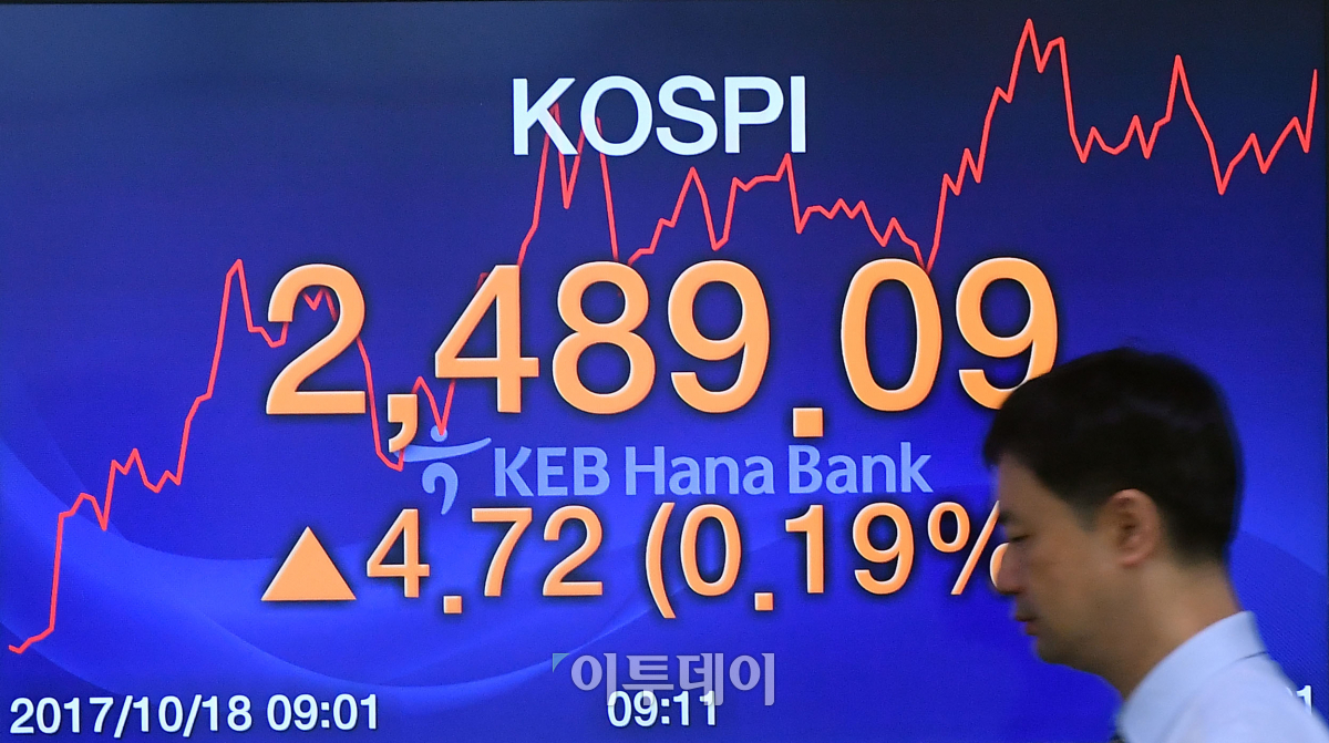 코스피가 6거래일 연속 장중 최고치를 경신한 가운데 18일 오전 서울 을지로 KEB하나은행 본점 딜링룸 전광판에 코스피 지수가 전 거래일 종가보다 4.72포인트 오른 2489.09를 나타내고 있다. 이동근 기자 foto@