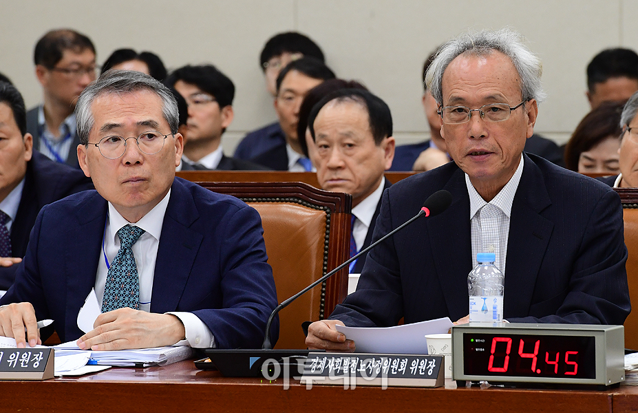 문성현 경제사회발전노사정위원장이 18일 서울 여의도 국회 환경노동위원회에서 열린 국정감사에서 의원들의 질의에 답변하고 있다. 고이란 기자 photoeran@