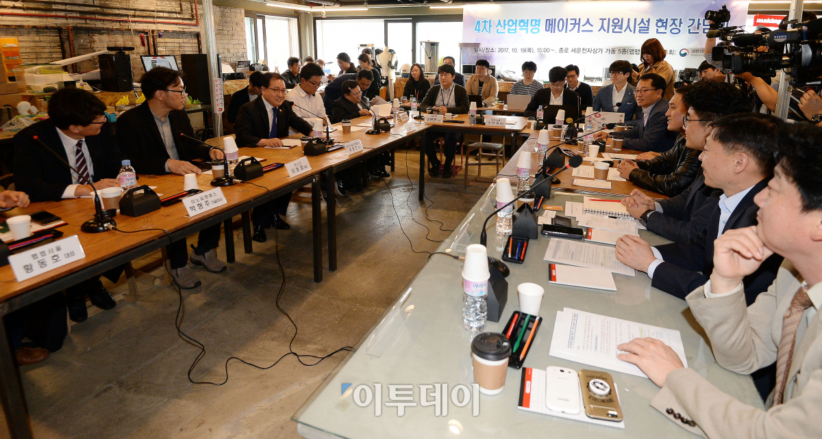 유영민(오른쪽에서 세 번째) 과학기술정보통신부 장관이 4차 산업혁명 메이커스 지원시설 현장 방문의 일환으로 19일 서울 종로구 세운상가 내 팹랩 서울을 방문해 업계 관계자들과 간담회를 갖고 있다. 이동근 기자 foto@