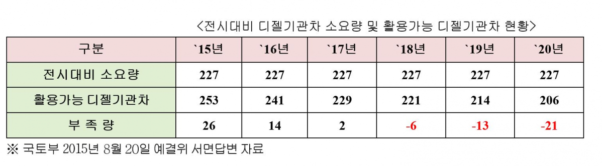 20일 자유한국당 이우현 의원(국회 국토교통위원회)이 국토교통부에서 받은 자료에 따르면 국토부는 2013년 ‘전시대비기관차 및 비축 유류 소요량’이라는 연구 용역을 발주해 연구 용역 결과 전시 대비 비축물자인 디젤기관차 적정 대수는 227대로 만일의 사태를 위해 유지해야 한다는 결과를 냈다. 한국철도공사는 이 연구 용역 결과에 따라 2015년 상반기부터 필요한 전시대비기관차를 구축하기 시작했다.