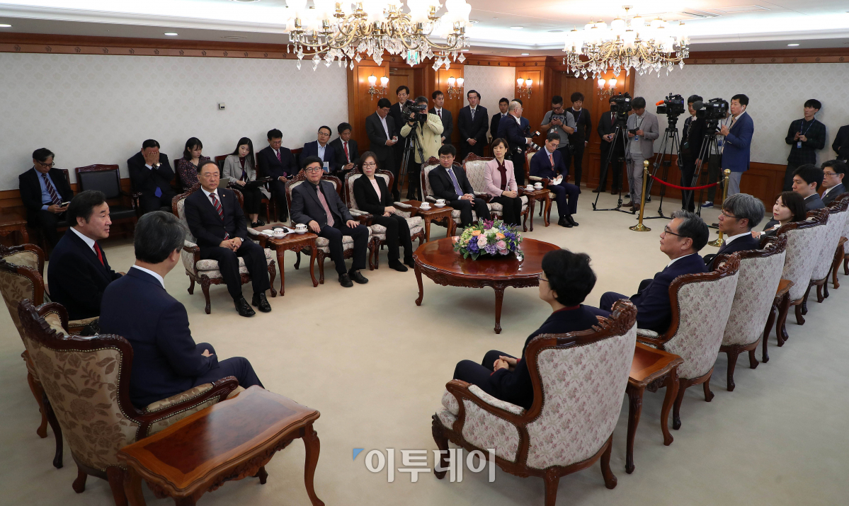 이낙연 국무총리가 20일 서울 세종로 정부서울청사에서 신고리 5,6호기 공론화위원회로 부터 정부권고안을 받고 위원들과 대화하고 있다. 이동근 기자 foto@