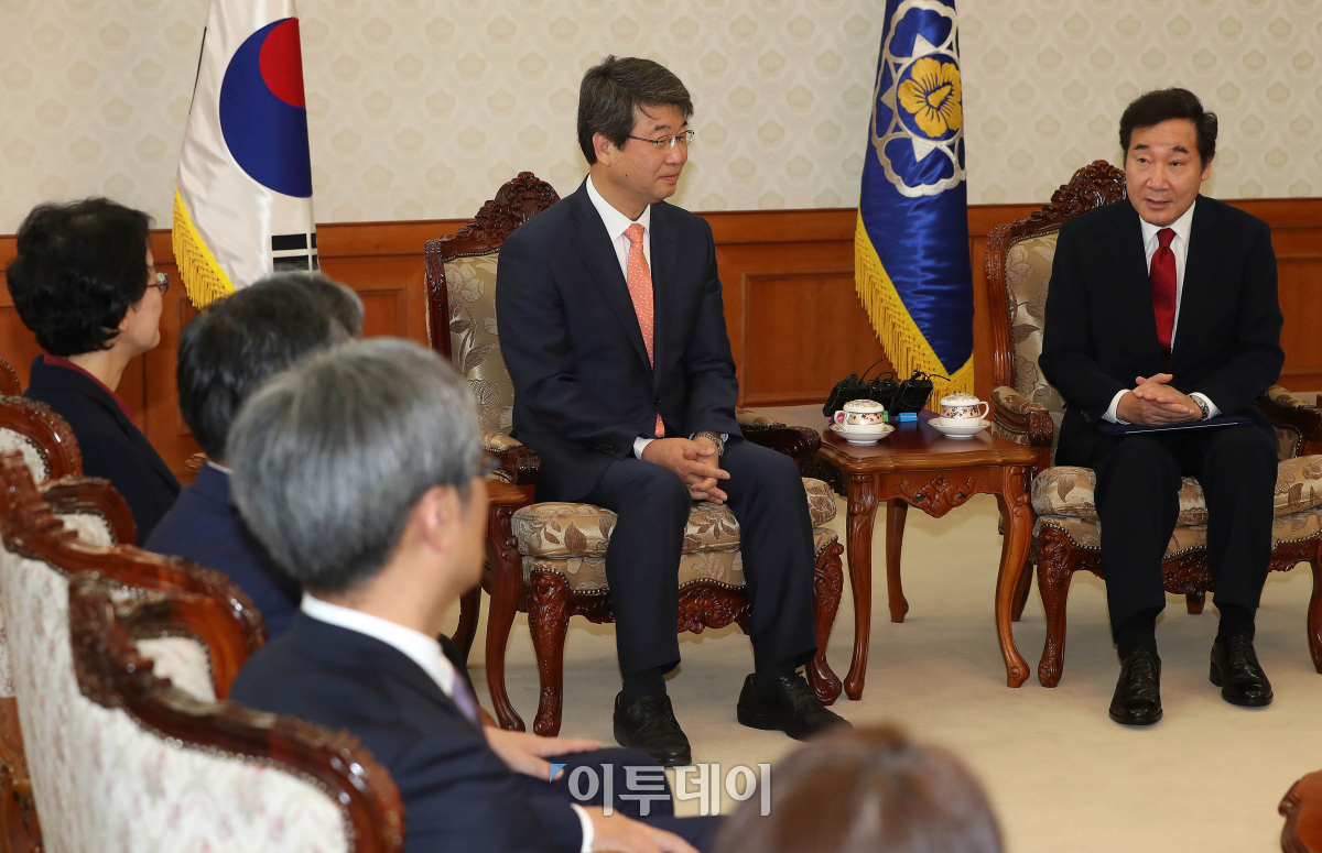 이낙연(오른쪽) 국무총리가 20일 서울 세종로 정부서울청사에서 신고리 5,6호기 공론화위원회로 부터 정부권고안을 받고 김지형 위원장, 위원들과 대화하고 있다. 이동근 기자 foto@