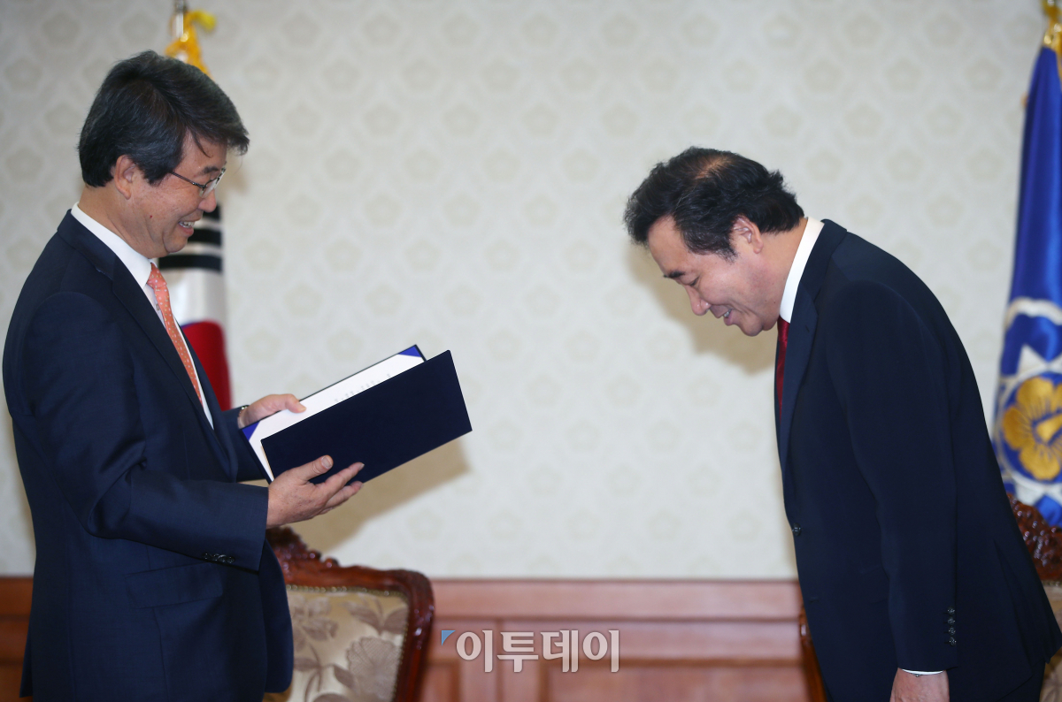 이낙연(오른쪽) 국무총리가 20일 서울 세종로 정부서울청사에서 신고리 5,6호기 공론화위원회의 정부권고안 발표 후 김지형 공론화 위원장으로부터 조사결과를 전달받고 있다. 이동근 기자 foto@