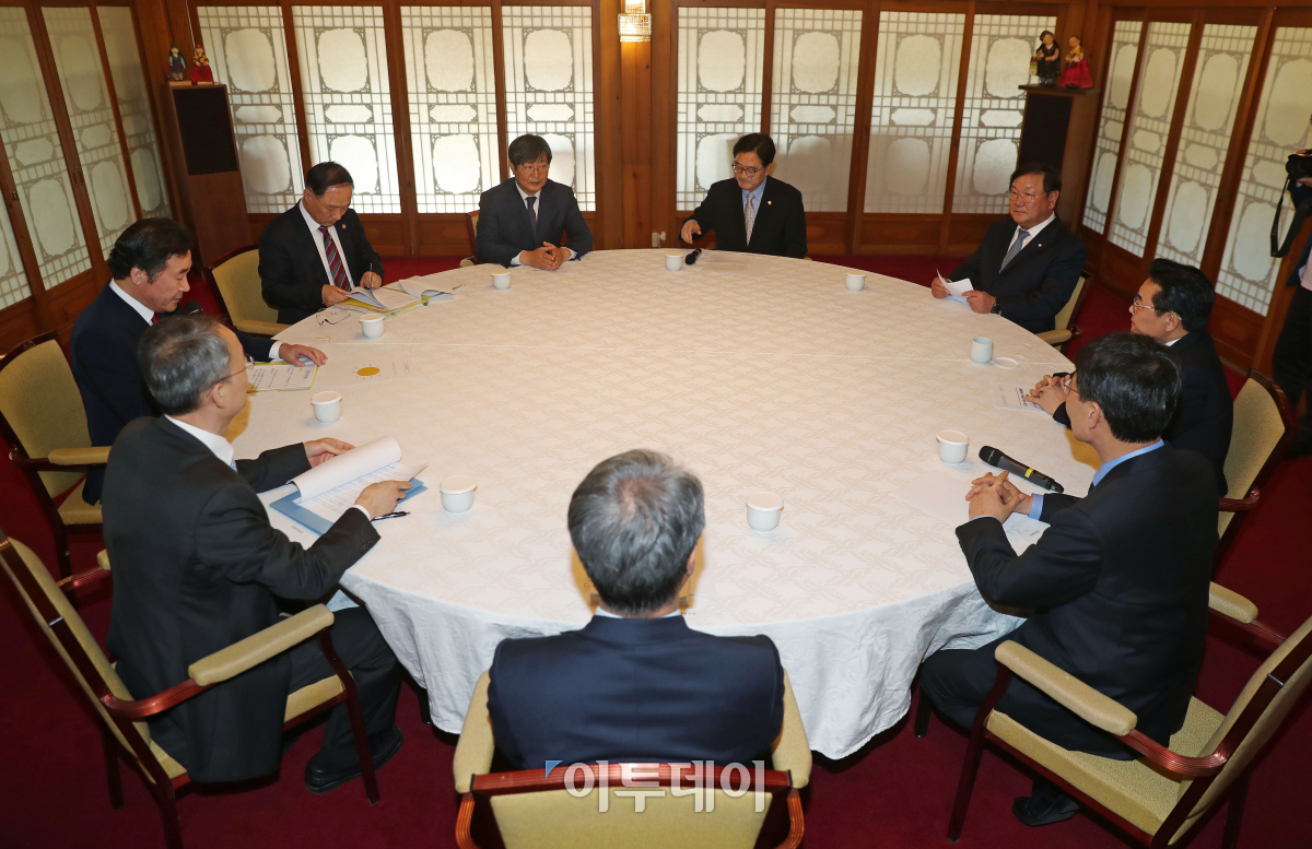 신고리 5,6호기 공론화위원회의 대정부권고안이 발표된 20일 서울 종로구 총리공관에서 열린 고위당정청 협의가 열리고 있다. 이날 우원식 더불어민주당 원내대표, 김태년 정책위의장, 이춘석 사무총장, 이낙연 국무총리, 백운규 산업부 장관, 홍남기 국무조정실장, 장하성 청와대 정책실장, 김수현 사회수석, 전병헌 정무수석이 참석했다. 이동근 기자 foto@