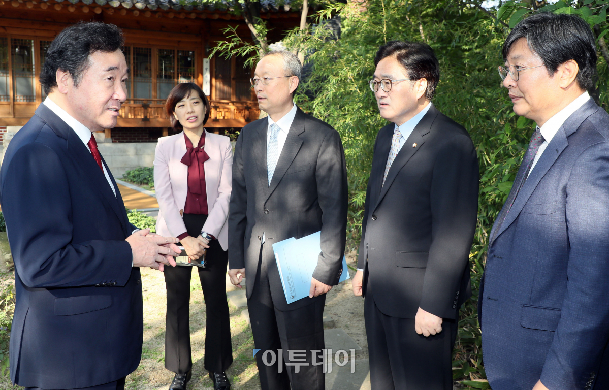 신고리 5,6호기 공론화위원회의 대정부권고안이 발표된 20일 서울 종로구 총리공관에서 열린 고위당정청 협의에서 이낙연(왼쪽) 국무총리, 우원식(오른쪽에서 두 번째) 더불어민주당 원내대표 등 참석자들이 대화하고 있다. 이동근 기자 foto@