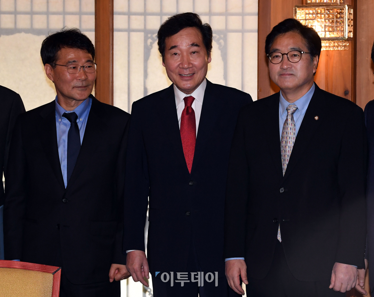 신고리 5,6호기 공론화위원회의 대정부권고안이 발표된 20일 서울 종로구 총리공관에서 열린 고위당정청 협의에서 이낙연(가운데) 국무총리, 우원식(오른쪽) 더불어민주당 원내대표, 장하성 청와대 정책실장이 기념촬영을 하고 있다. 이동근 기자 foto@