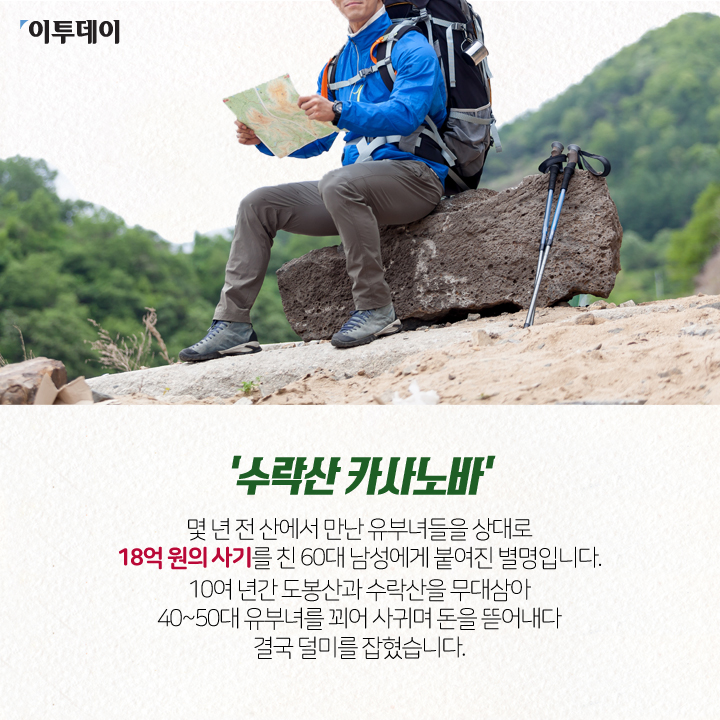 몇 년 전 산에서 만난 유부녀들을 상대로 18억 원의 사기를 친 60대 남성에게 붙여진 별명입니다. 10여 년간 도봉산과 수락산을 무대삼아 40~50대 유부녀를 꾀어 사귀며 돈을 뜯어내다 결국 덜미를 잡혔습니다.