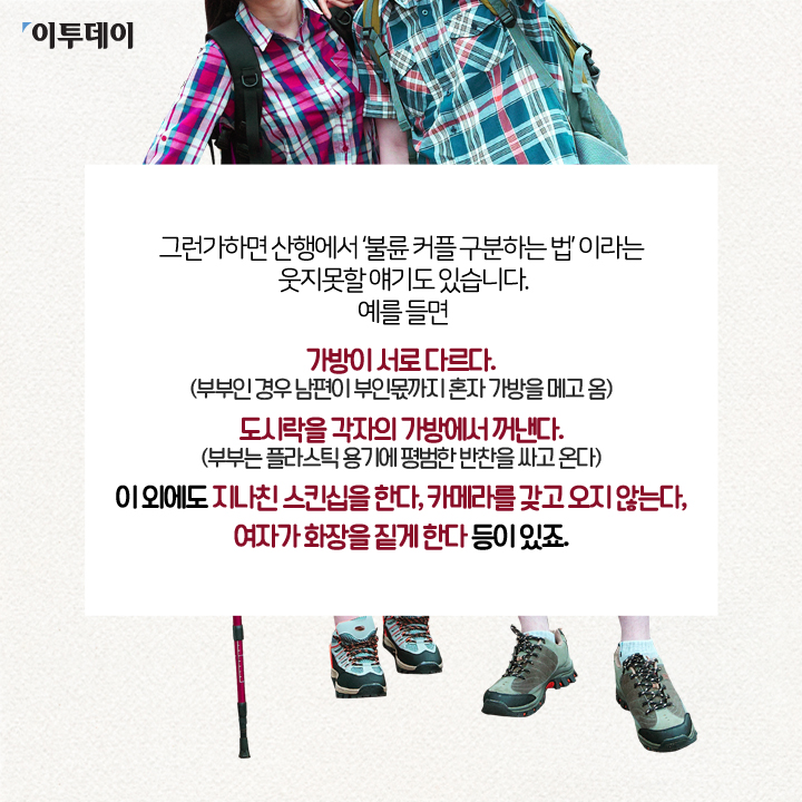 그런가하면 산행에서 ‘불륜 커플 구분하는 법’ 이라는 웃지못할 얘기도 있습니다.