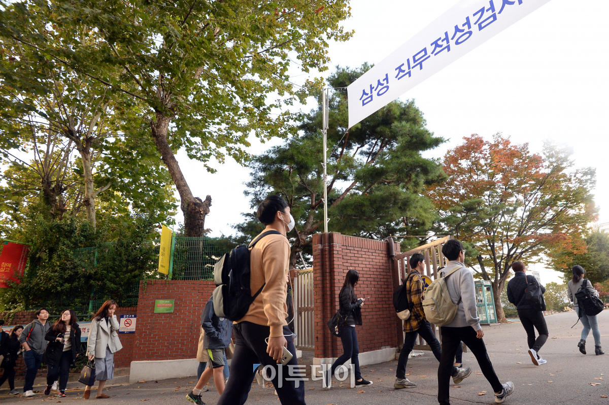 삼성그룹 직무적성검사(GSAT)가 22일 전국 5개 도시(서울, 부산, 대구, 대전, 광주)와 미국 일부 지역에서 일제히 실시된 가운데 지원자들이 서울 강남구 단대부고에 마련된 고사장으로 향하고 있다. 이동근 기자 foto@