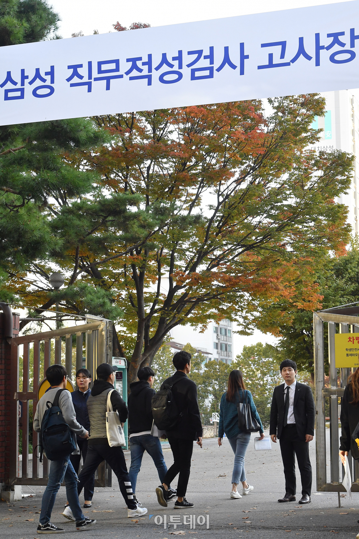 삼성그룹 직무적성검사(GSAT)가 22일 전국 5개 도시(서울, 부산, 대구, 대전, 광주)와 미국 일부 지역에서 일제히 실시된 가운데 지원자들이 서울 강남구 단대부고에 마련된 고사장으로 향하고 있다. 이동근 기자 foto@