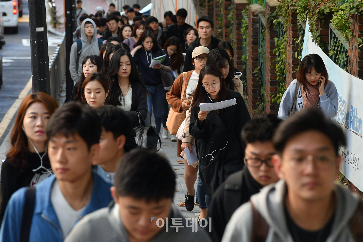 삼성그룹 직무적성검사(GSAT)가 22일 전국 5개 도시(서울, 부산, 대구, 대전, 광주)와 미국 일부 지역에서 일제히 실시된 가운데 지원자들이 서울 강남구 단대부고에 마련된 고사장으로 향하고 있다. 이동근 기자 foto@