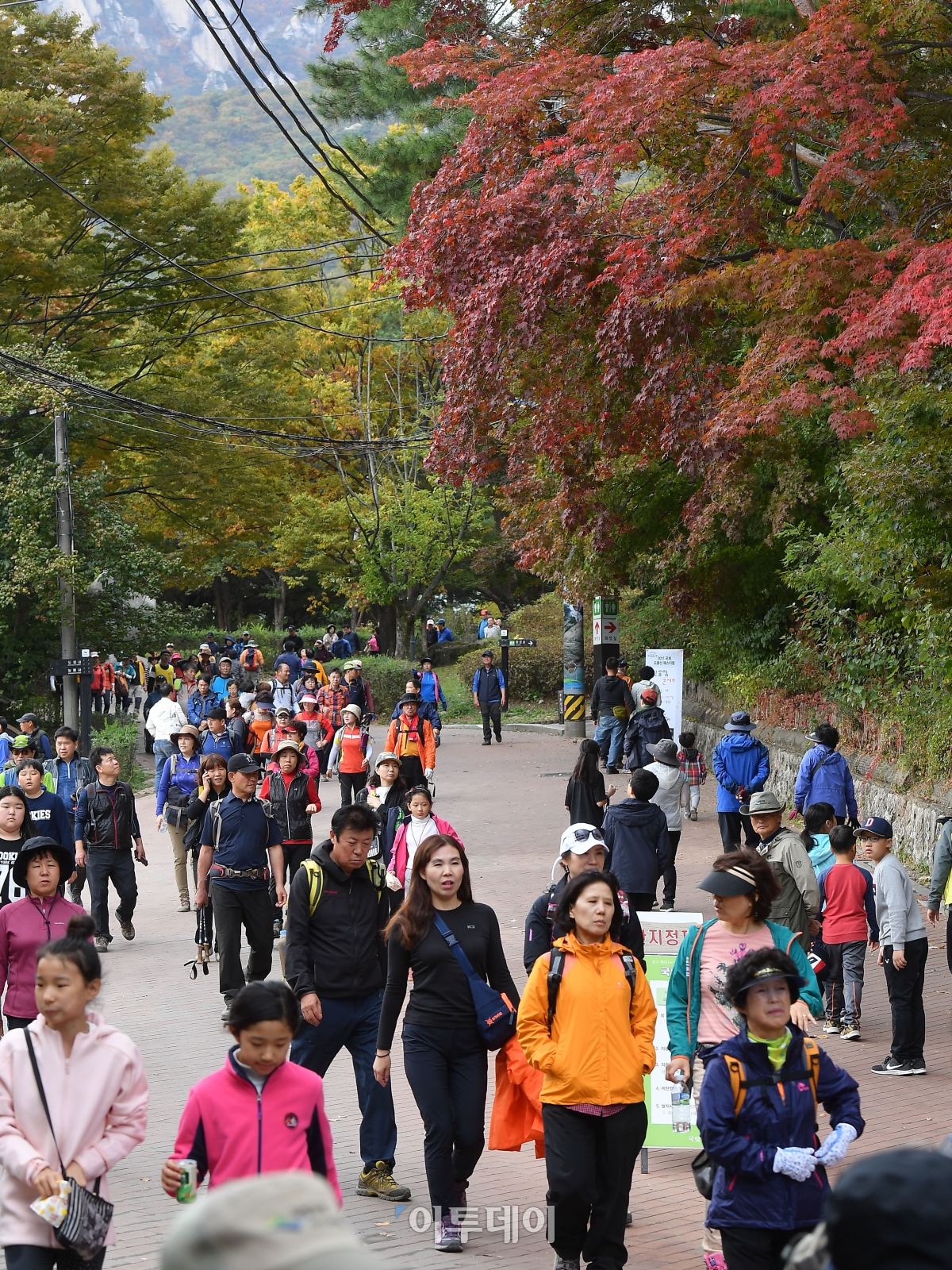 가을의 마지막 절기인 상강을 하루 앞둔 22일 서울 도봉산을 찾은 등산객들이 곱게 물든 단풍길을 걸으며 가을의 정취를 즐기고 있다. 이동근 기자 foto@