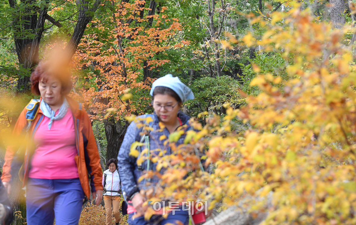 가을의 마지막 절기인 상강을 하루 앞둔 22일 서울 도봉산을 찾은 등산객들이 곱게 물든 단풍길을 걸으며 가을의 정취를 즐기고 있다. 이동근 기자 foto@