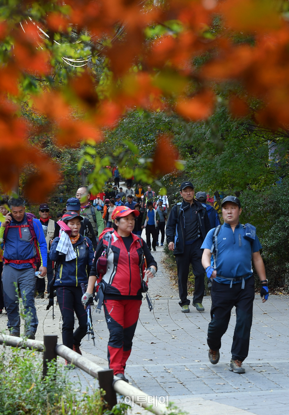 가을의 마지막 절기인 상강을 하루 앞둔 22일 서울 도봉산을 찾은 등산객들이 곱게 물든 단풍길을 걸으며 가을의 정취를 즐기고 있다. 이동근 기자 foto@