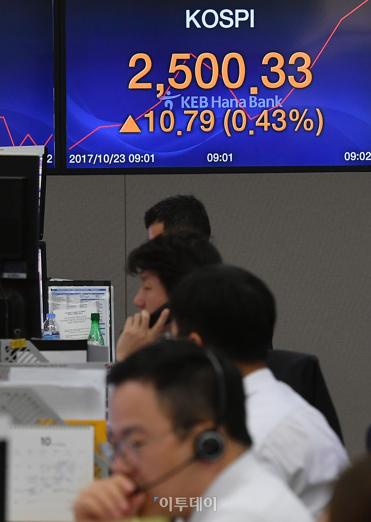 상승세로 출발한 코스피가 장 초반 2500선을 돌파했다. 23일 오전 서울 을지로 KEB하나은행 딜링룸 전광판에 코스피 지수가 전 거래일 종가보다 10.79포인트 오른 2500.33을 나타내고 있다.  이동근 기자 foto@