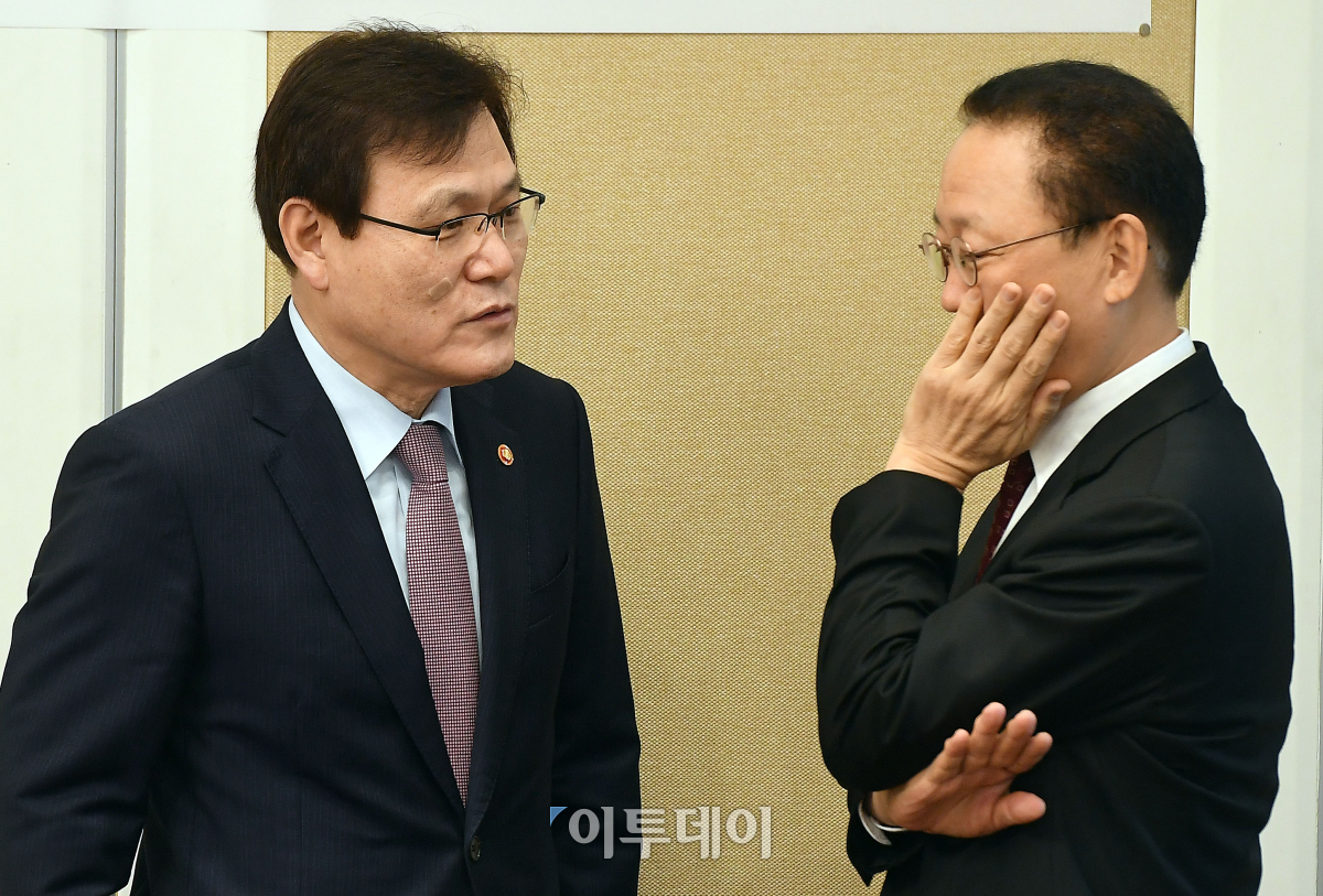 최종구(왼쪽) 금융위원장과 최흥식 금융감독원장이 23일 오전 서울 여의도 국회에서 열린 가계부채 종합대책 당정협의에서 대화하고 있다. 이동근 기자 foto@