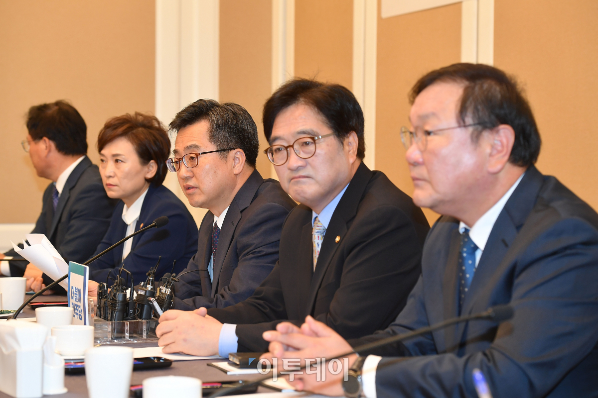 김동연(가운데) 경제부총리 겸 기획재정부 장관이 23일 오전 서울 여의도 국회에서 열린 가계부채 종합대책 당정협의에서 모두발언을 하고 있다. 이동근 기자 foto@