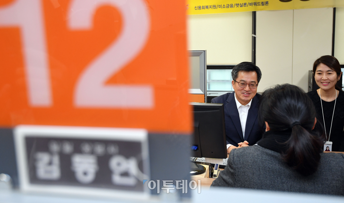 김동연 경제부총리 겸 기획재정부 장관이 가계부채 대책 발표 전 서민 금융 현장 방문의 일환으로 23일 서울 중구 중앙서민금융통합지원센터를 방문해 일일금융상담사로 나서 상담을 하고 있다. 이동근 기자 foto@