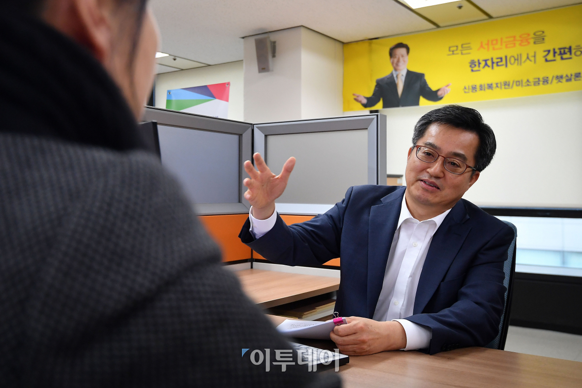 김동연 경제부총리 겸 기획재정부 장관이 가계부채 대책 발표 전 서민 금융 현장 방문의 일환으로 23일 서울 중구 중앙서민금융통합지원센터를 방문해 일일금융상담사로 나서 상담을 하고 있다. 이동근 기자 foto@