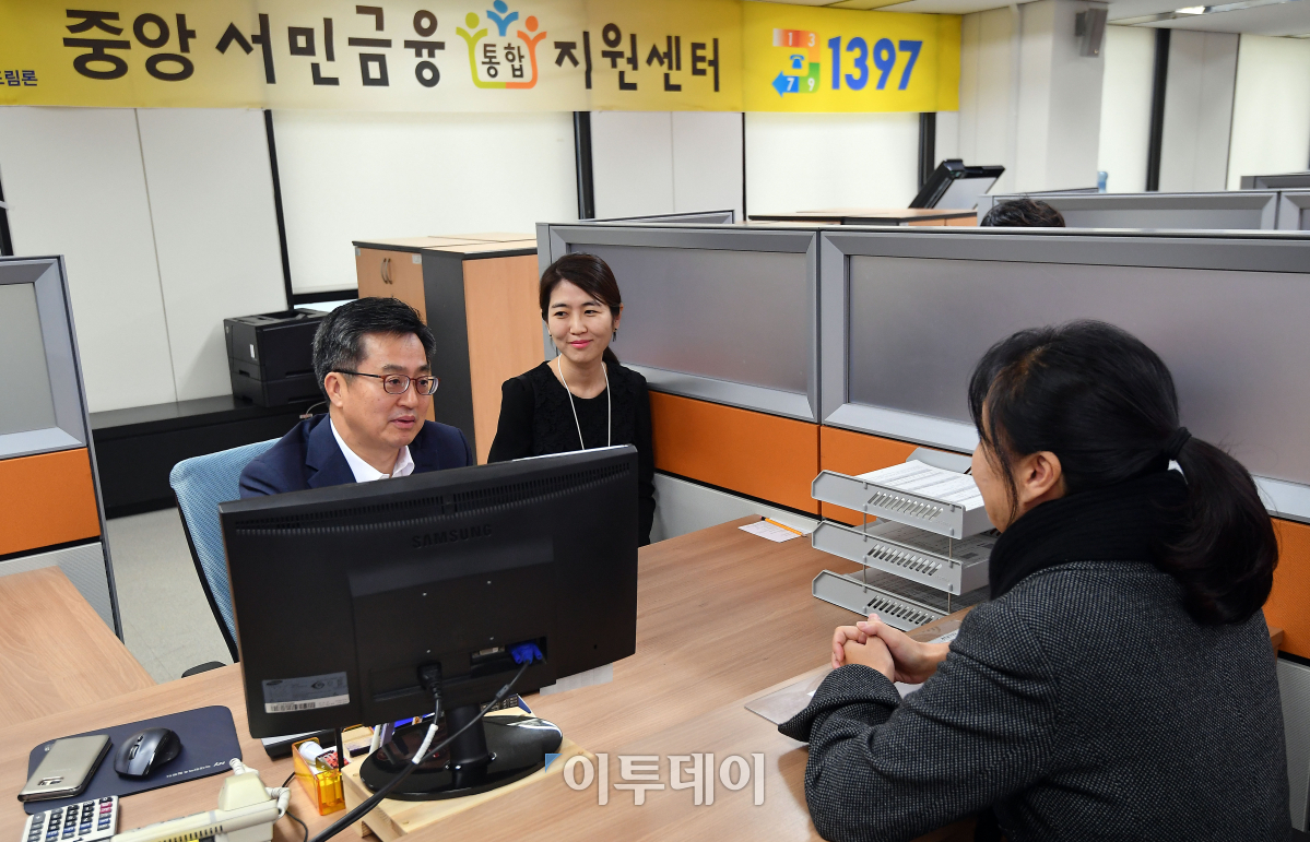 김동연 경제부총리 겸 기획재정부 장관이 가계부채 대책 발표 전 서민 금융 현장 방문의 일환으로 23일 서울 중구 중앙서민금융통합지원센터를 방문해 일일금융상담사로 나서 상담을 하고 있다. 이동근 기자 foto@