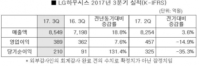 LG하우시스는 3분기 영업이익이 389억1700만 원으로 전년 동기 대비 7.6% 증가했다고 23일 공시했다. 같은 기간 매출액은 8548억9000만 원으로 18.8% 늘었으며, 당기순이익은 210억300만 원으로 131.4% 급증했다.