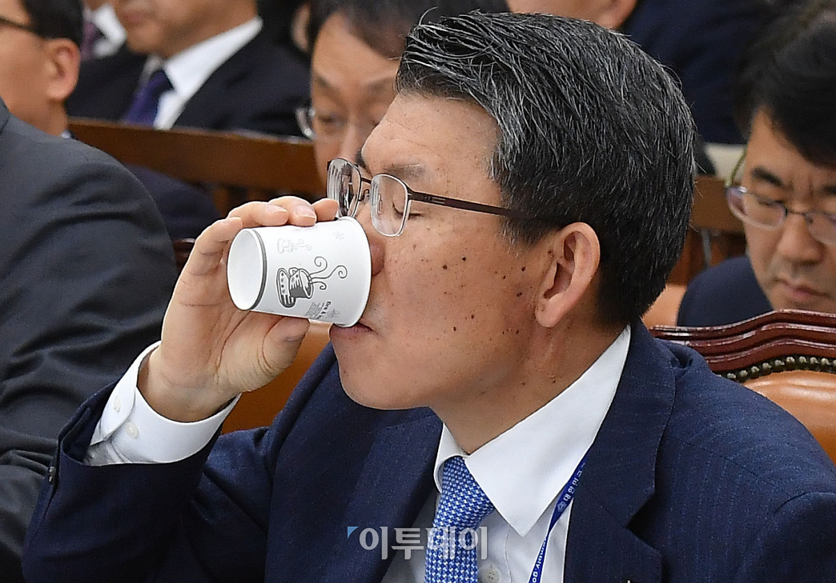 은성수 한국수출입은행장이 24일 서울 여의도 국회 기획재정위원회에서 열린 수출입은행 국정감사에서 물을 마시고 있다. 이동근 기자 foto@