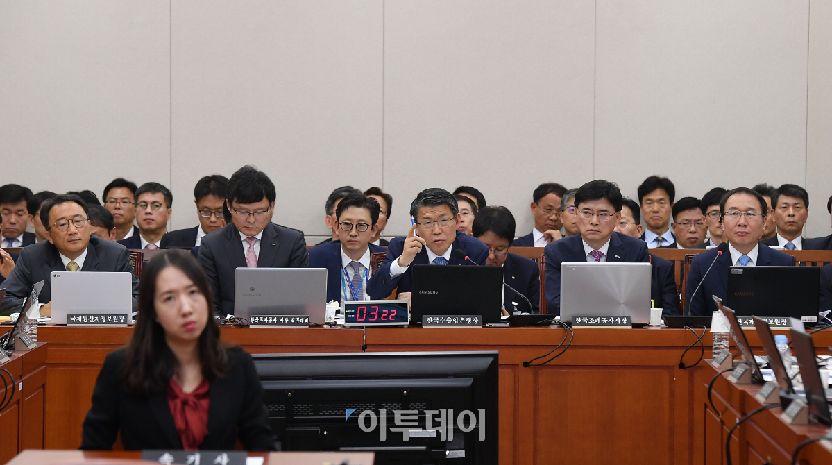 은성수(가운데) 한국수출입은행장이 24일 서울 여의도 국회 기획재정위원회에서 열린 수출입은행 국정감사에서 질의에 답하고 있다. 이동근 기자 foto@