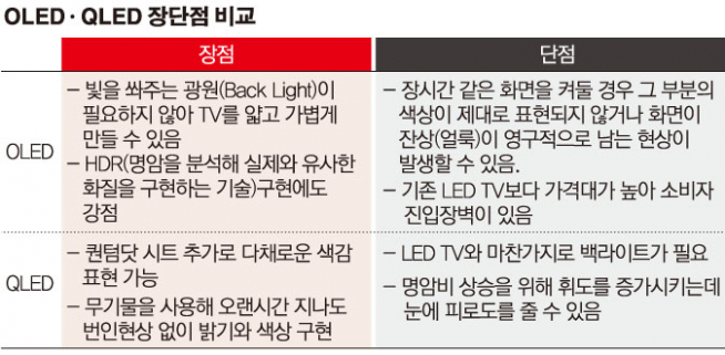 삼성전자는 “OLED는 TV를 뒤에서 빛을 쏴주는 광원이 필요하지 않기 때문에 TV를 보다 얇고 가볍게 만들 수 있지만 유기물이라는 한계 탓에 픽셀(화소) 수명이 줄어들면서 ‘번인 현상’이 발생한다”며 “무기물인 퀀텀닷(양자점)을 사용하는 QLED TV는 쉽게 변하지 않아 이 같은 문제가 없다”고 밝혔다.