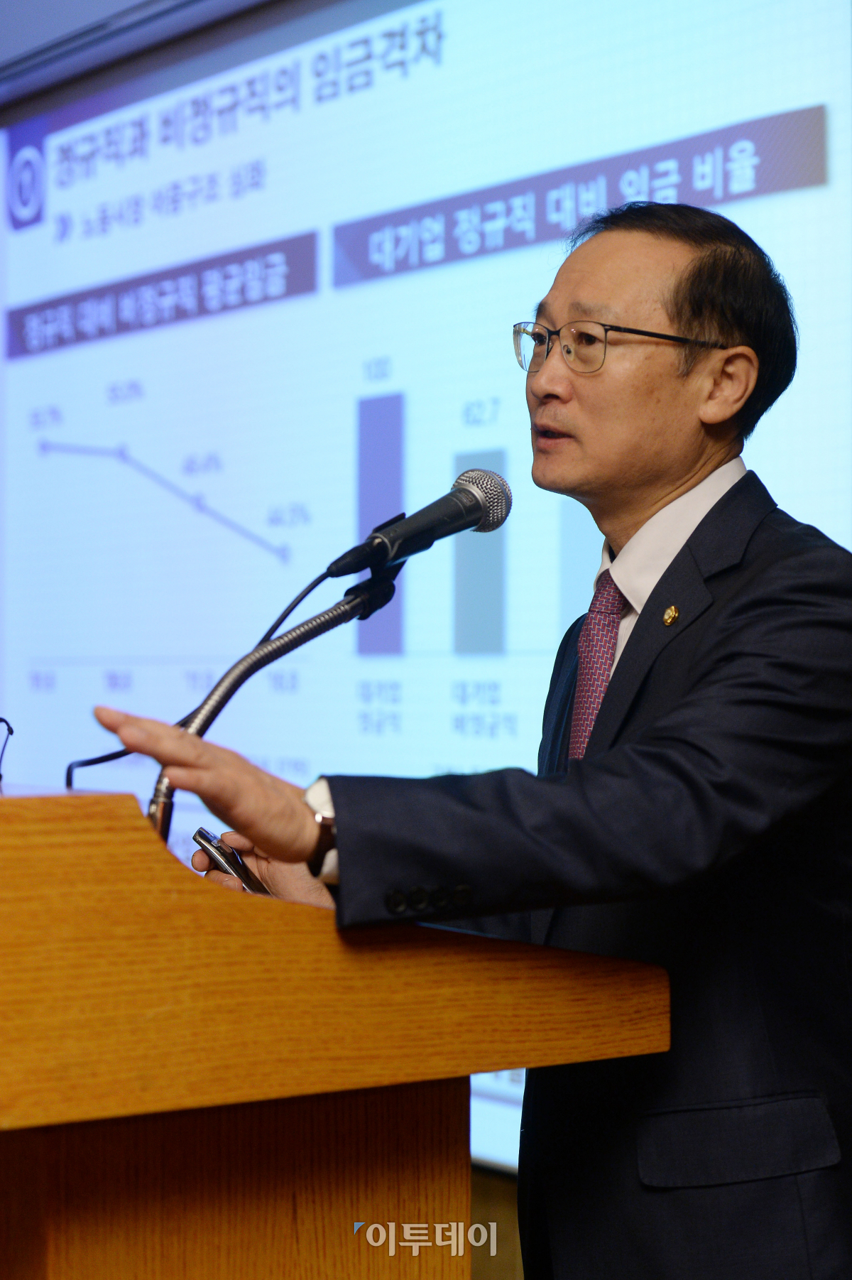 홍영표 국회 환경노동위원장이 25일 오전 서울 소공동 롯데호텔에서 열린 대한상의 고용노동위원회 제61차 회의에 참석해 '일자리주도성장과 노동정책'을 주제로 강연하고 있다. 이동근 기자 foto@