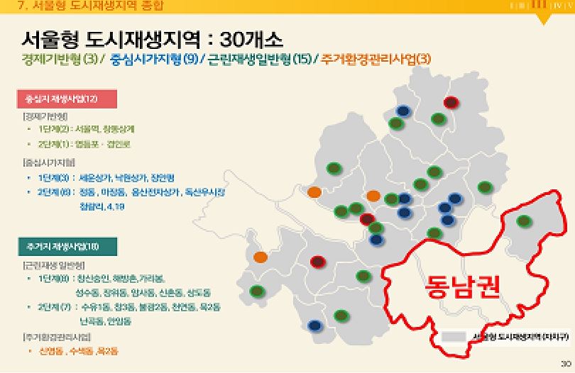 동남권은 서초구, 강남구, 송파구, 강동구로 이뤄져 있다. 이 지역 주민 일부는 도시재생선도지역에서 제외된 것을 두고 “서울시가 강남을 역차별하는 것이 아니냐”는 의혹까지 제기하는 상황이다.