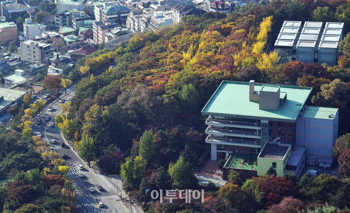 가을이 깊어지고 있는 가운데 25일 N서울타워에서 바라본 남산도서관 일대가 단풍으로 울긋불긋 물들어가고 있다. 이동근 기자 foto@