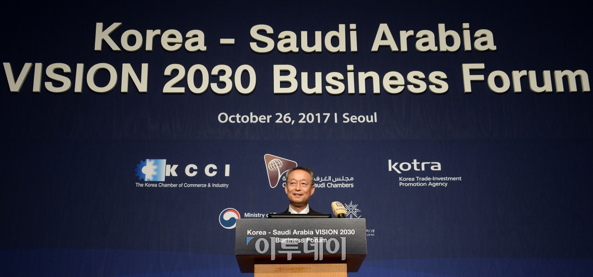 백운규 산업통상자원부 장관이 26일 오전 서울 송파구 롯데호텔월드에서 열린 '한-사우디 비전 2030 비즈니스 포럼에서 축사를 하고 있다. 이동근 기자 foto@