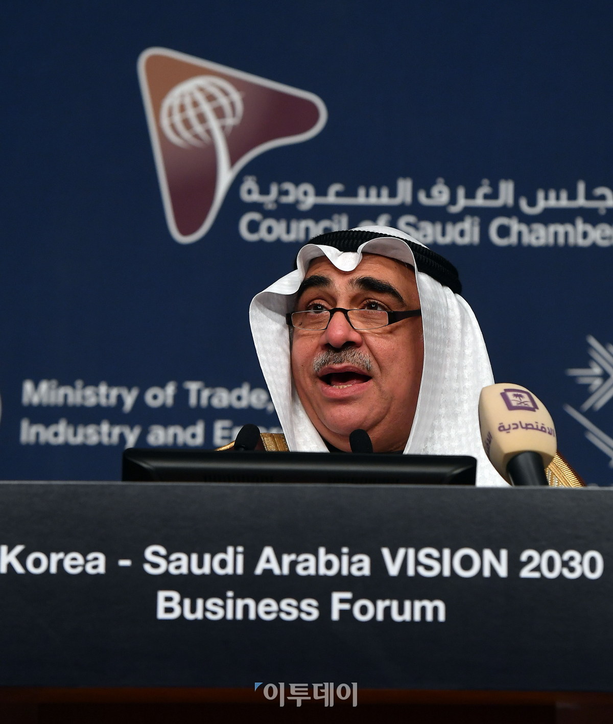 아델 파키흐 사우디아라비아 경제기획부 장관이 26일 오전 서울 송파구 롯데호텔월드에서 열린 '한-사우디 비전 2030 비즈니스 포럼에서 축사를 하고 있다. 이동근 기자 foto@