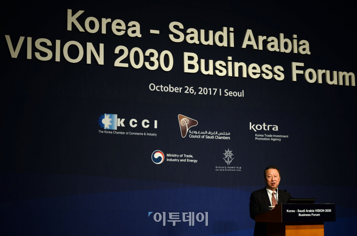 박용만 대한상의 회장이 26일 오전 서울 송파구 롯데호텔월드에서 열린 '한-사우디 비전2030 비즈니스 포럼'에서 개회사를 하고 있다. 이동근 기자 foto@