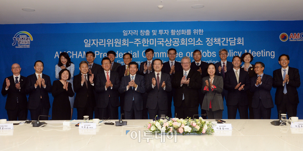 이용섭(앞줄 오른쪽에서 여섯 번째) 일자리위원회 부위원장, 제임스 김 암참 회장(앞줄 오른쪽에서 일곱 번째)이 26일 서울 중구 대한상공회의소 챔버라운지에서 열린 일자리위원회-주한미국상공회의소(암참) 정책간담회에서 참석자들과 기념촬영을 하고 있다. 이동근 기자 foto@
