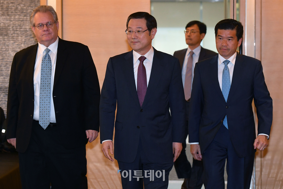 이용섭 일자리위원회 부위원장과 제임스 김 암참 회장이 26일 서울 중구 대한상공회의소 챔버라운지에서 열린 일자리위원회-주한미국상공회의소(암참) 정책간담회에 참석하기 위해 입장하고 있다. 앞줄 왼쪽부터 제프리 존스 암참 이사장, 이 부위원장, 김 회장. 뒷줄은 이호승 일자리위원회일자리위원회 기획단장. 이동근 기자 foto@