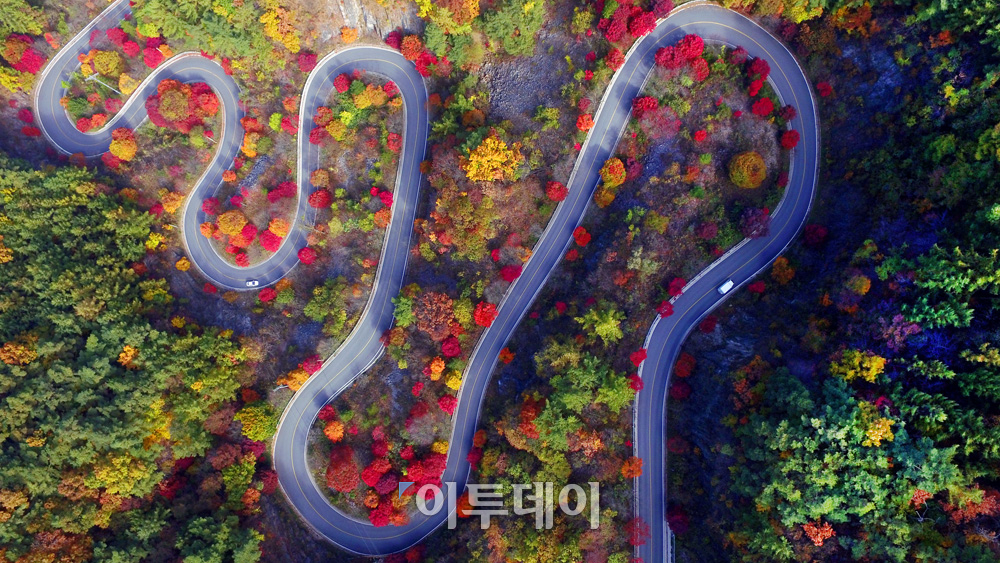 가을이 절정으로 치닫고 있다. 26일 충북 단양군 보발재 일대의 단풍이 한 폭의 그림같은 풍경을 연출하고 있다. 최유진 기자 strongman55@