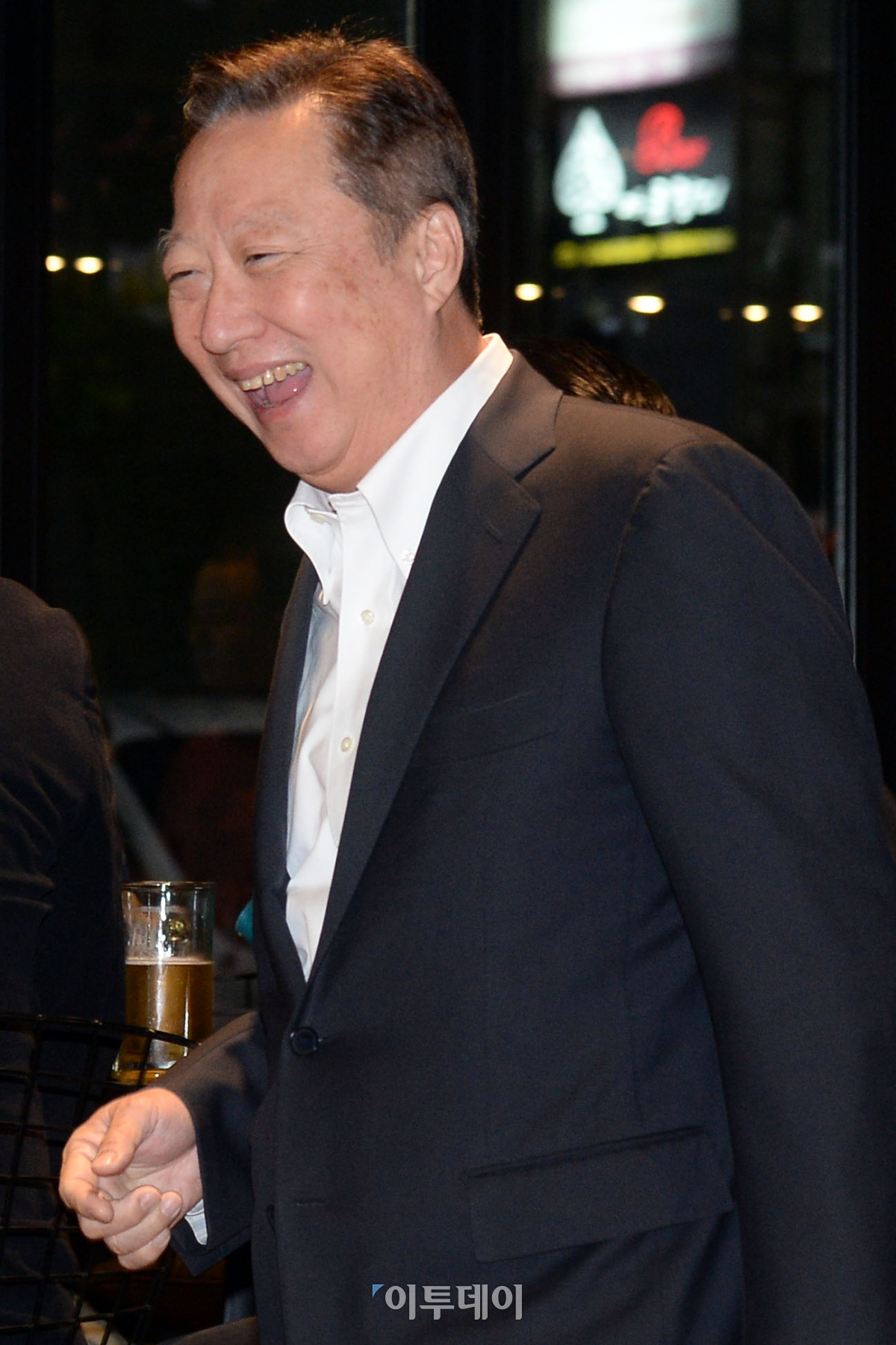 박용만 대한상공회의소 회장이 26일 서울 여의도 한국노총을 방문한 후, 김주영 위원장과 인근 호프집에 들어서며 함박웃음을 짓고 있다. 이동근 기자 foto@