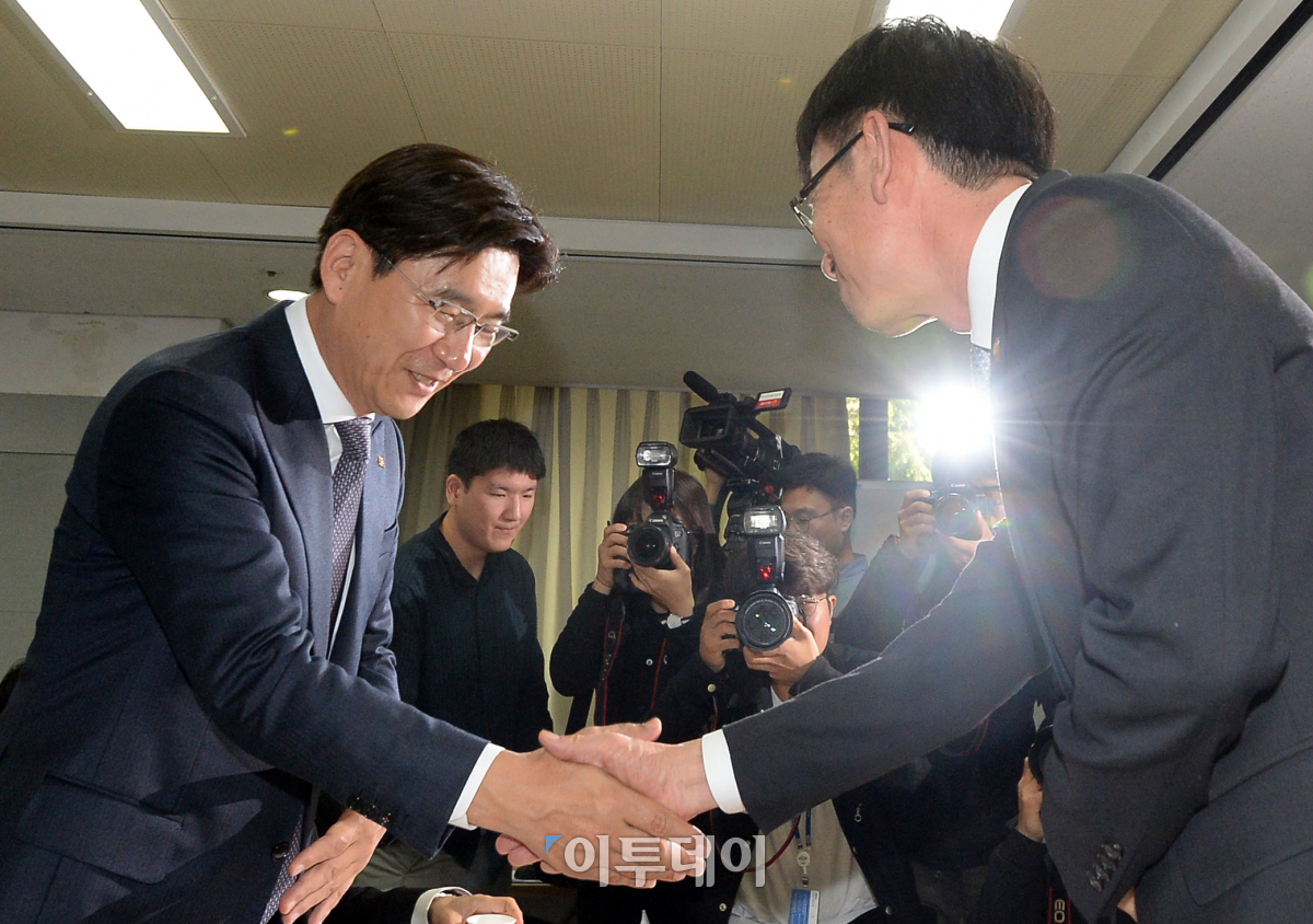 김상조(오른쪽) 공정거래위원장과 박기영 한국프랜차이즈산업협회장이 27일 서울 여의도 중소기업중앙회에서 열린 '한국 프랜차이즈산업협회 자정혁신안 발표 기자간담회에서 악수하고 있다. 이동근 기자 foto@