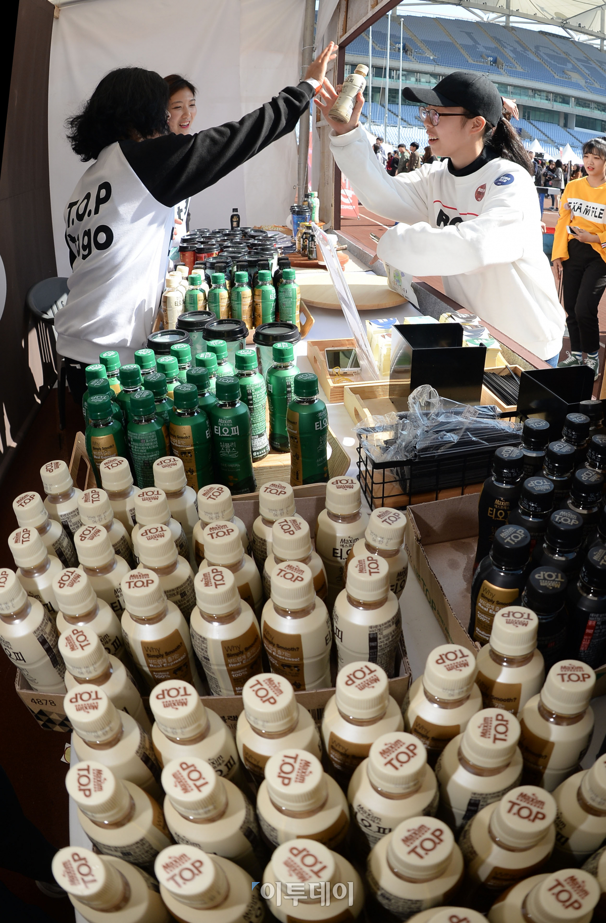 청춘을 위한 복합문화 페스티벌 '청춘아레나'가 28일 인천 남구 문학경기장에서 열렸다. 이날 행사장에 마련된 동서식품 홍보부스에서 시민들이 음료 시음을 하고 있다. 이동근 기자 foto@
