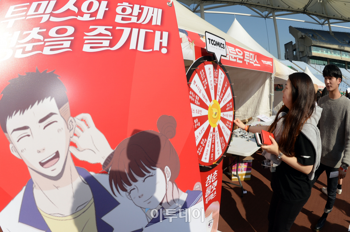청춘을 위한 복합문화 페스티벌 '청춘아레나'가 28일 인천 남구 문학경기장에서 열렸다. 이날 행사장에 마련된 웹툰 플랫폼 '투믹스' 홍보부스에서 시민들이 이벤트에 참여하고 있다. 이동근 기자 foto@