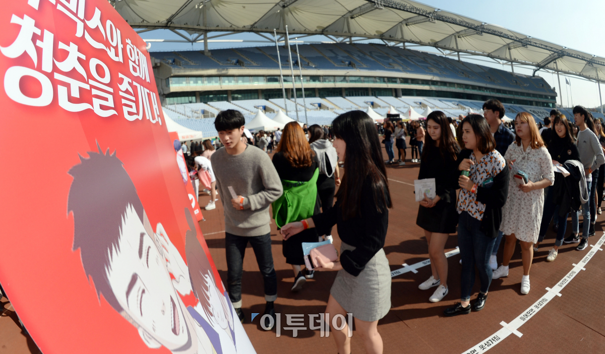청춘을 위한 복합문화 페스티벌 '청춘아레나'가 28일 인천 남구 문학경기장에서 열렸다. 이날 행사장에 마련된 웹툰 플랫폼 '투믹스' 홍보부스에서 시민들이 이벤트에 참여하고 있다. 이동근 기자 foto@