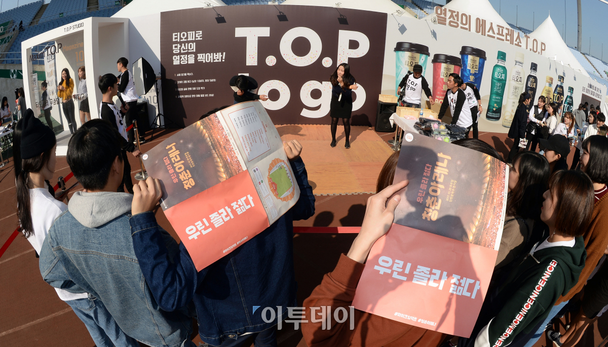청춘을 위한 복합문화 페스티벌 '청춘아레나'가 28일 인천 남구 문학경기장에서 열렸다. 이날 행사장에 마련된 동서식품 홍보부스에서 시민들이 이벤트에 참여하고 있다. 이동근 기자 foto@